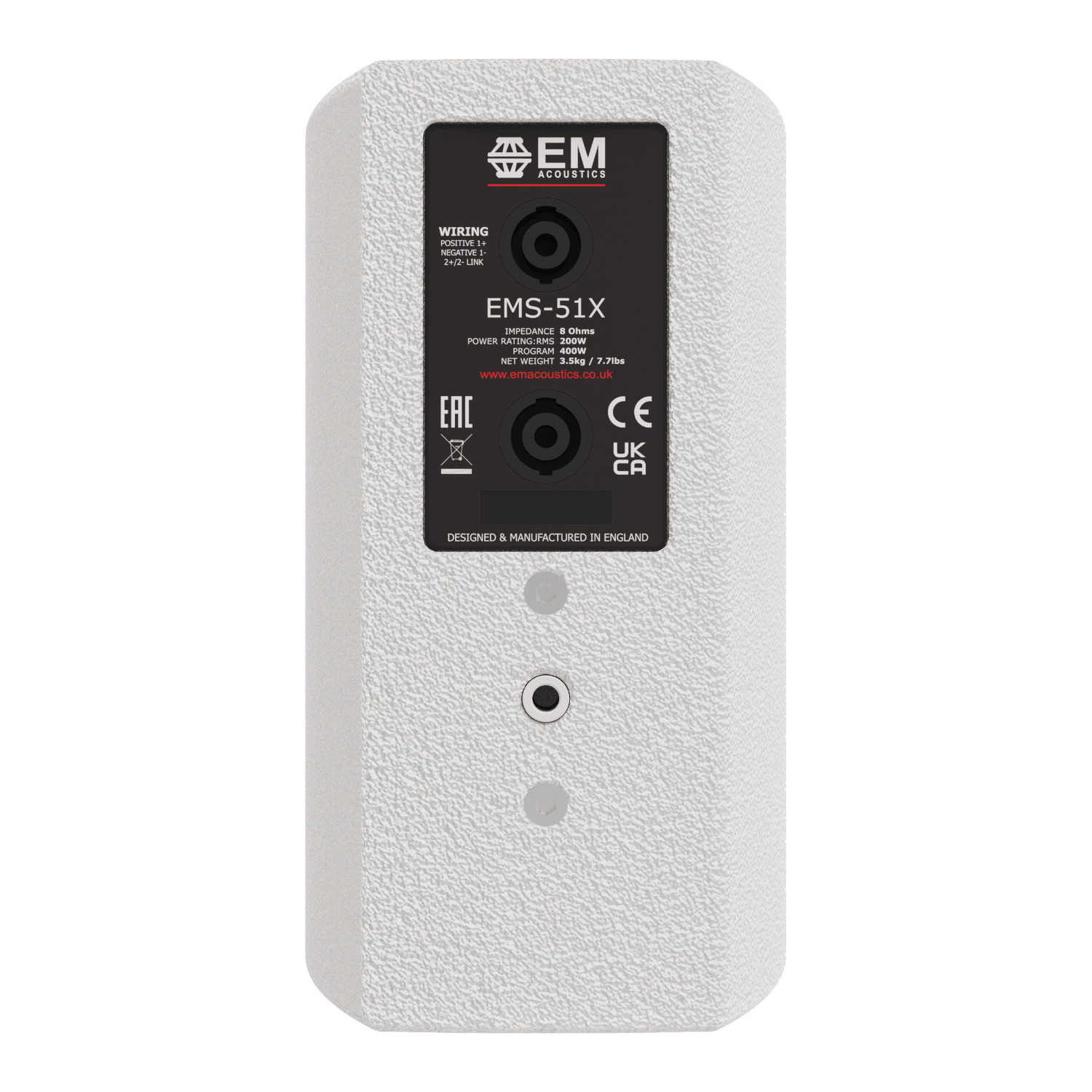 The EMS-51 is completely passive, yet outperforms many bi-amplified or DSP-processed designs. The enclosure contains a 5” (127mm) LF drive unit, linked via the internal passive crossover network to a 1.1” (28mm) diaphragm HF soft dome drive unit which produces a 75° conical dispersion pattern. Unusually for a loudspeaker of this size, it is an infinite baffle design which gives a smoother LF rolloff and a much more robust LF performance than would be expected from an enclosure of this size.